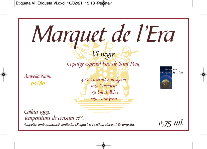 Etiqueta de vi “Marquet de l’Era”. Ampolles limitades (150 ampolles).