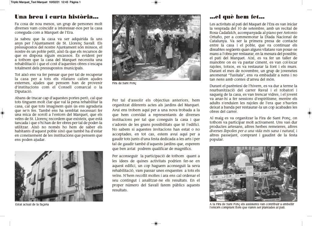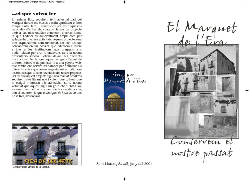 Tríptic de promoció, del Grup Pro Marquet de l’Era, de la Masia del Marquet per als actes que s’han dut i es durant a terme en un futur i el seu full de ruta.
